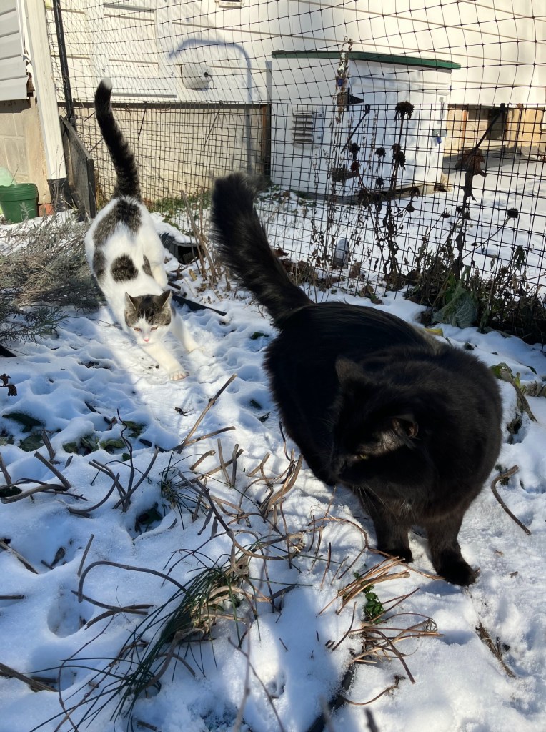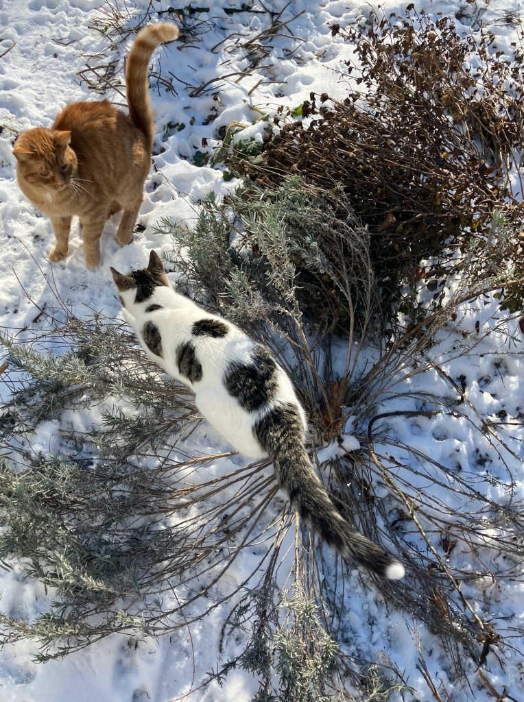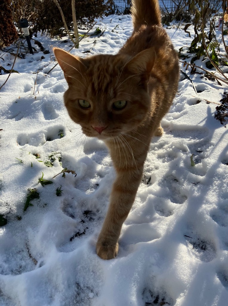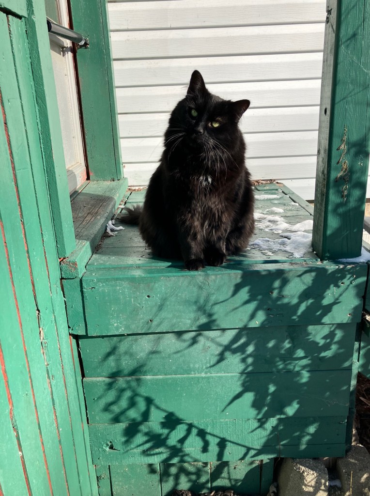 Freyja’s not the only cat who likes to be out in the snow. As long as the wind is not blowing, and the sun is out, there’s a whole cast of characters out there.