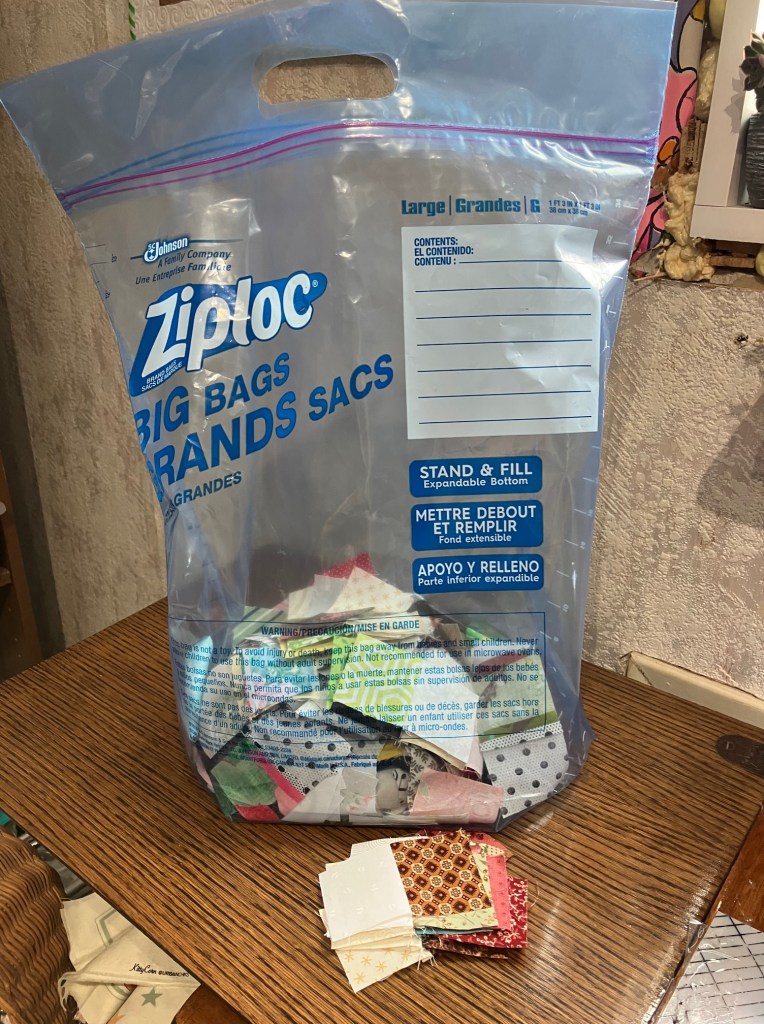 That Ziploc “Big Bag” is stated to hold about 11 litres/3 gallons of “stuff” You can see, I’ve got it about 1/5 full of wee little pairs. I still have TONNES of squares cut and ready to sew (and Mom gives me more almost every time I see her), so I won’t be sewing these two-patches into four-patches anytime soon. in fact, I think this is going to end up being a year-long Leader/Ender project. And I’m ok with that!