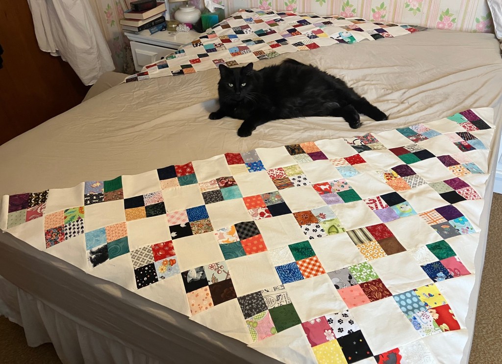 I’d hope to finish the whole top on the weekend, but I’d underestimated just how many four patches I’d made. And of course, as each row grows, they take longer to make. Burton and I managed eight rows on Saturday afternoon (four more per side). I have enough four patches left for at least 10 more rows, plus the middle row which will make everything line up right.