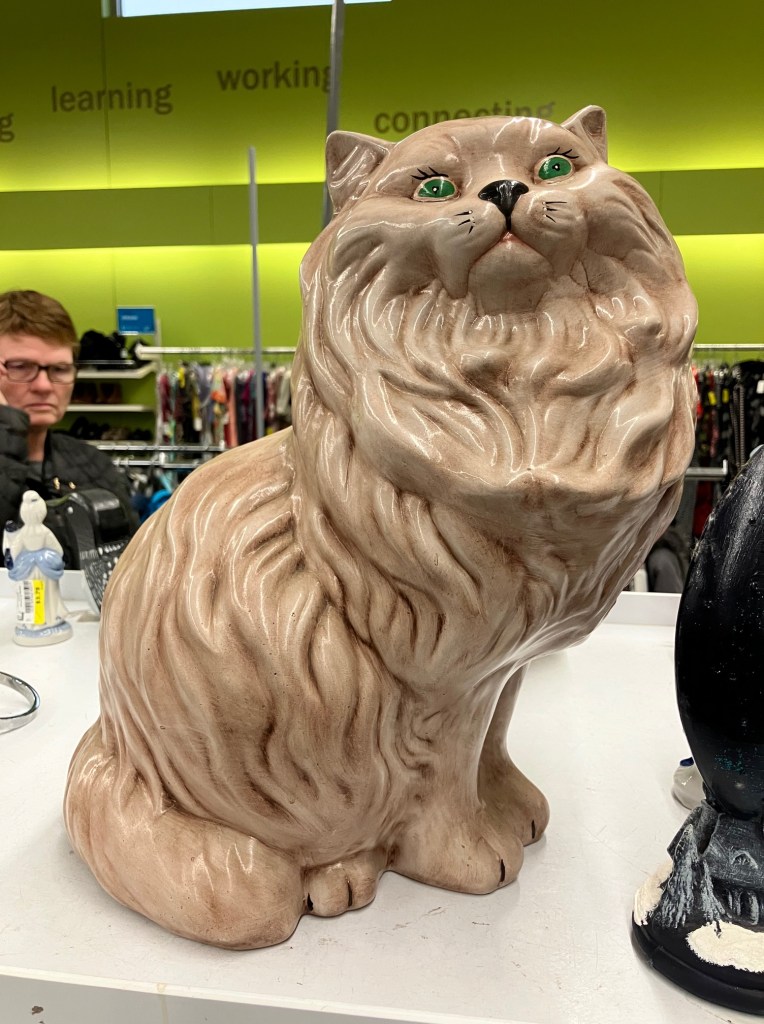 If you follow any thrifting pages, you may be familiar with these Persian cats. Like my mushroom canisters, they were part of the paint your own ceramics craze of the 70s and 80s. There are several sizes and styles. You most often see them in white, but I’ve seen them done in a Blue Mountain Pottery glaze. And on the internet, I’ve seen them in all colours and coats. I, of course, have been looking for a black one… for obvious reasons…