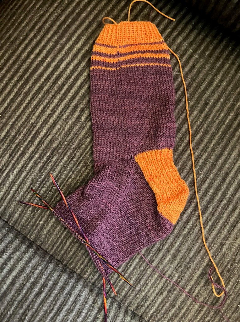 I don’t. But I’m close. I’m only about an inch from starting the stripes before the toe. In fact, I’ll probably finish it up tonight while Dave is teaching and I have several quiet hours to myself. That will leave me a full two weeks to finish the second sock!