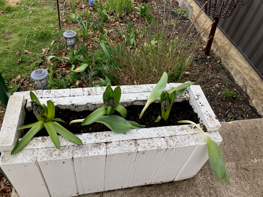 The tulips in the front boxes did not take well to the cold and have completely flopped. If they don’t perk up in the next week, I’ll replace them with some newer ones. Thankfully, the hyacinths seem ok.