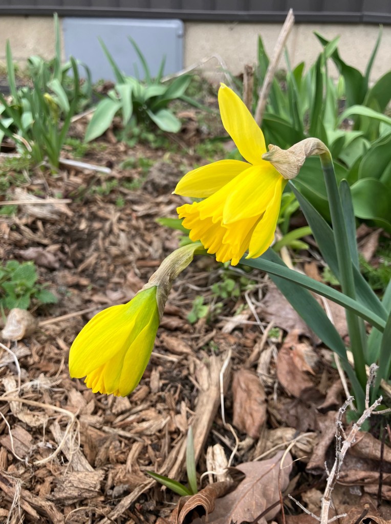 1. Same here. It’s been cold, windy and wet. More like March than April. Everything is waterlogged and droopy. The blooming cherry trees are making a real mess but never really got to show off this year.