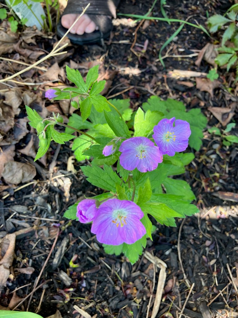 I have two decent size clumps of our Native Geranium. I think she’s so pretty. The one on the left is a little older and more robust. The shooting range I belong to is set in a little woodland area and it has lots of these coming up along the paths this time of year. It’s nice to see them growing wild and in my garden.