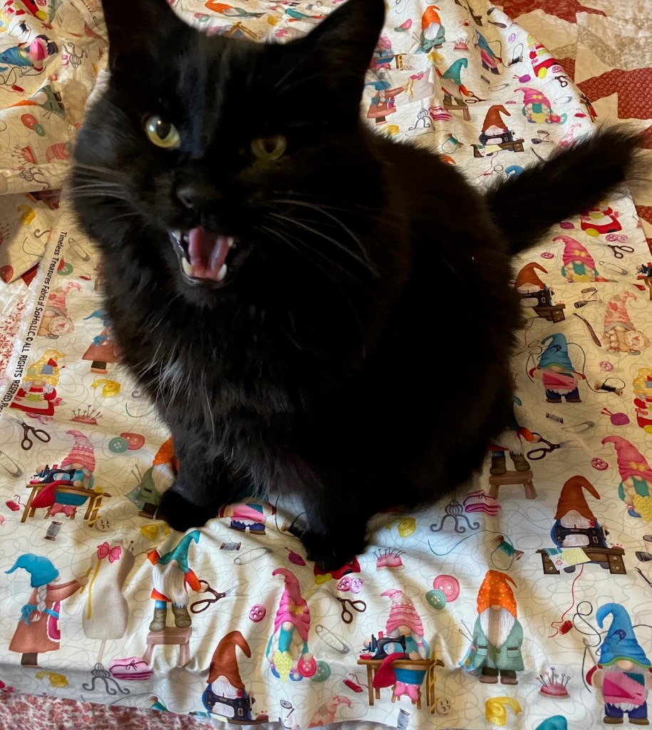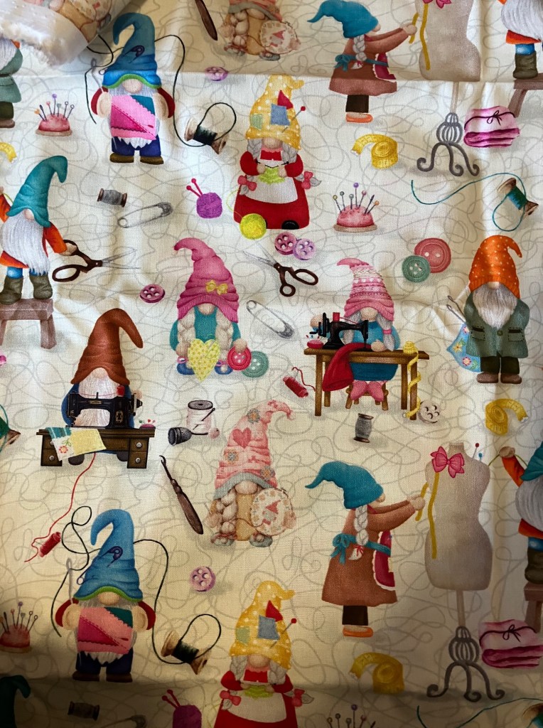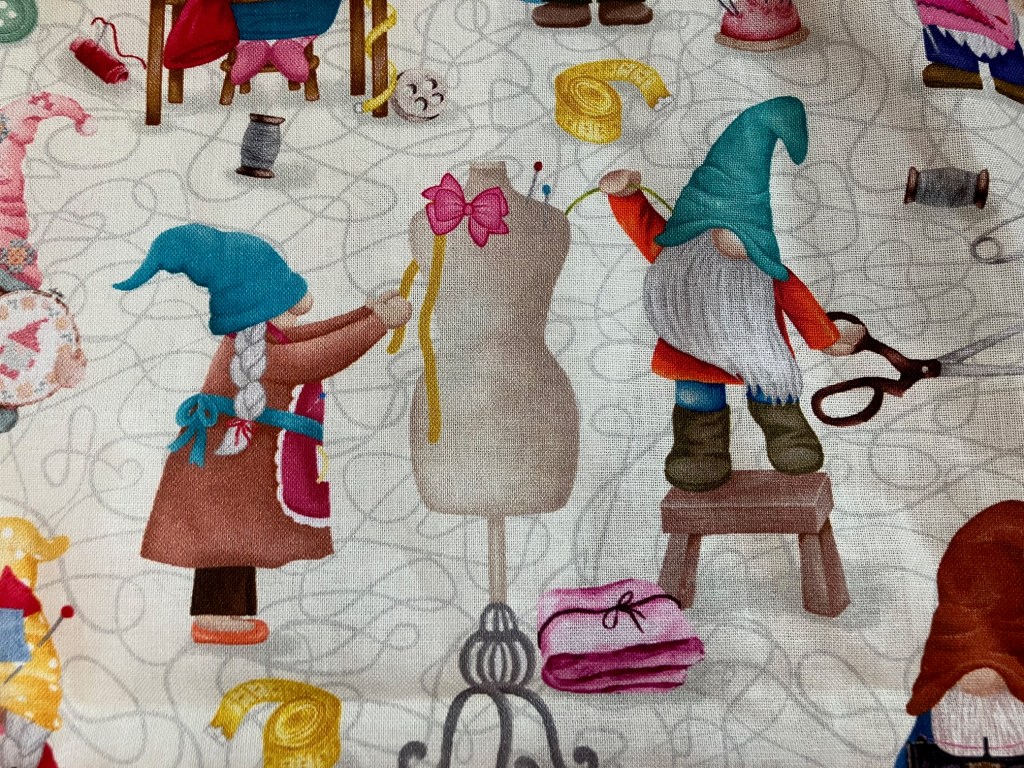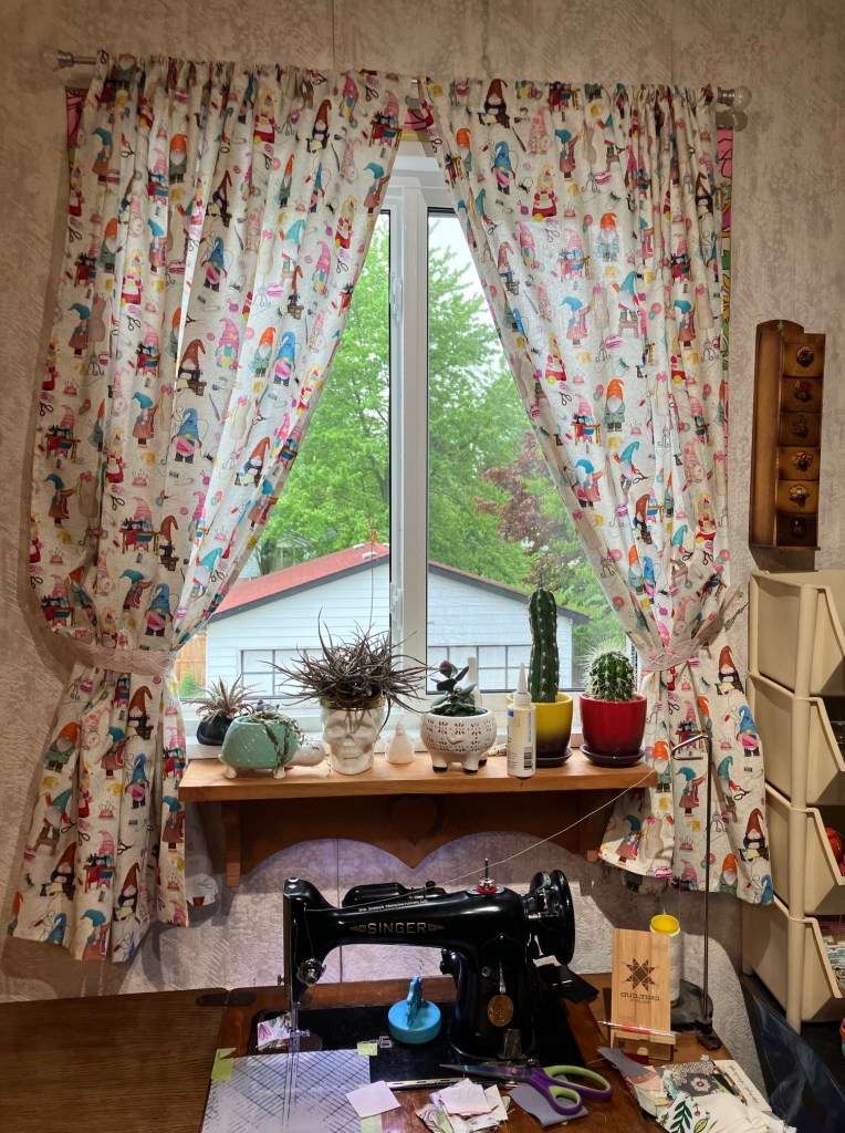I bought it back in 2023 with intentions to make new curtains for the studio window. The ones I had came down when we had the new windows put in (July 2023), and the old rod got tossed. I decided I needed new ones, and bought the fabric… but I didn’t have a new curtain rod, so the fabric got tossed in the stash and more or less forgotten about. But Dave and I were out on Tuesday other day, picking out a rod for the dining room window and I remembered my studio window was still in need too.