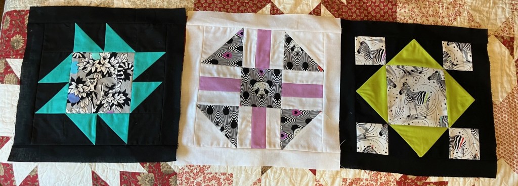 I was trying to figure out how Tula decided on these particular animals for the line (it’s called Sketchbook). Then I realized… Lemur, Panda, Zebra, they are all black and white. There’s a skunk print too I’ve yet use. I’ll probably use it for this week’s block… with a fourth accent colour – a nice bold coral.