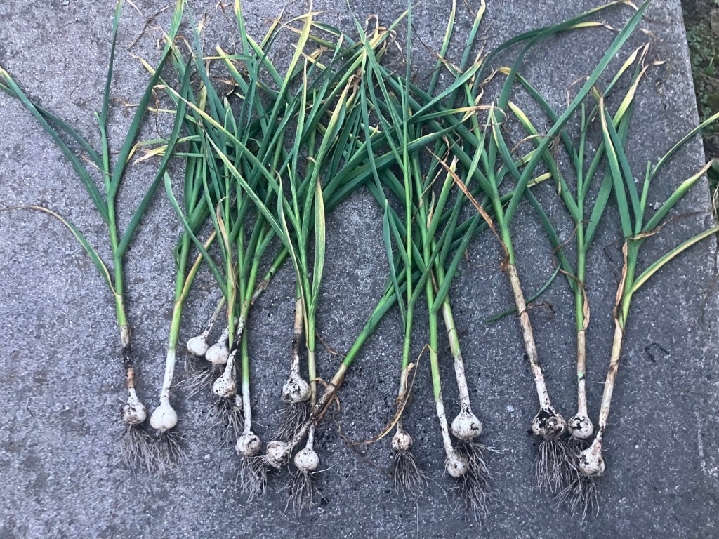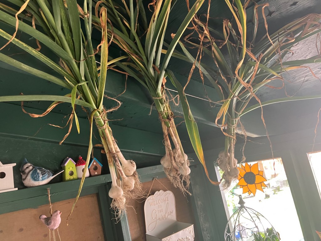 The garlic has been harvested and is now hanging in the sunporch to cure. I got 15 heads (planted 18). They are on the smaller side, but they are healthy so I’m happy.