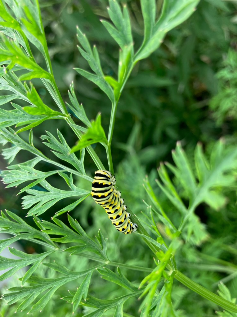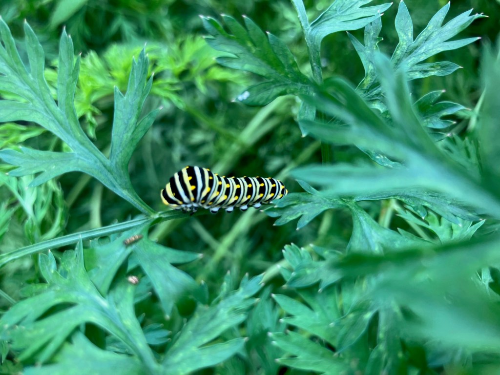 Interestingly enough…. I’ve never seen and Black Eastern Swallowtails here. Just the Tigers. So, imagine my surprise when I went out to inspect my carrots and found these guys…