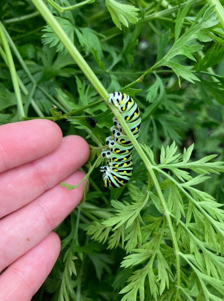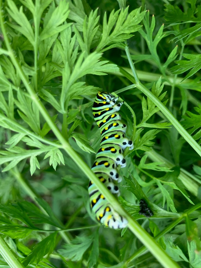 The other week, when I posted about the butterflies, I mentioned that I hoped the Tiger Swallowtail had laid some eggs in my carrots or parsley. But I wasn’t thinking… that’s the wrong kind of Swallowtail. Tiger Swallowtail caterpillars primarily feed on trees and shrubs in the families Magnoliaceae and Rosaceae, as well as other plants like birch, willow, and ash. Specifically, common host plants include tulip tree, sweet bay magnolia, and wild black cherry