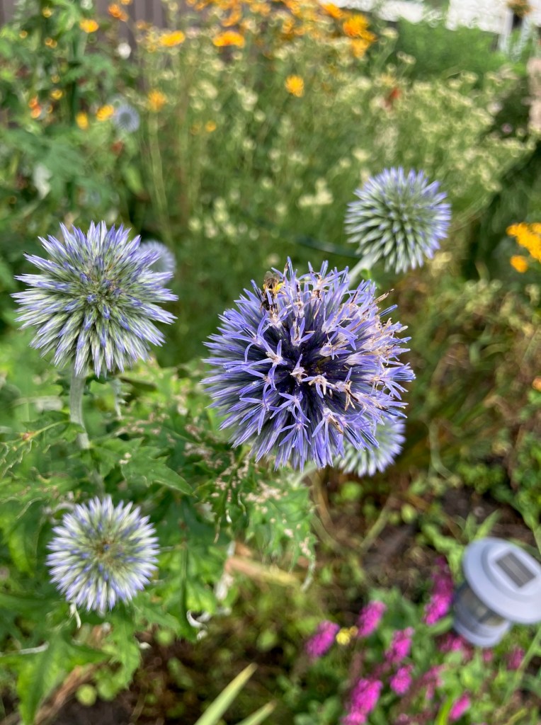 Globe Thistle! As you can see, I have it and blue and white and I adore both. It is on the prickly side (not terrible, but not the softest plant) but its worth it because those flower heads just look so cool! (The birds also love the seed heads)