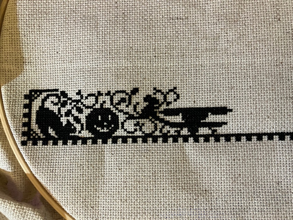 Nice start! That looks like a big piece. The cat stretching is so cute and I bet the dancing witches will be fun to stitch.