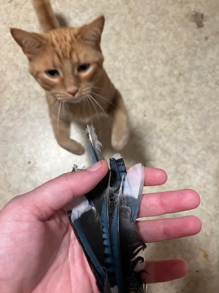 I was working away in the office, and Dave came up to tell me Lemmy got a Bluejay. He’d come out to find Lemmy throwing the carcass around the catio yard. He took care of the body, but there were still feather everywhere.