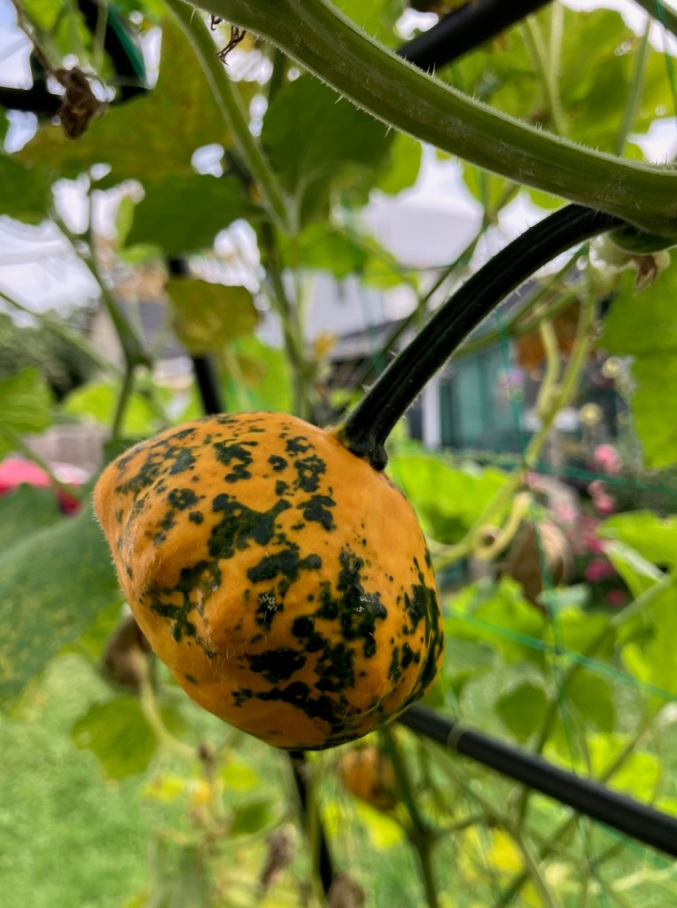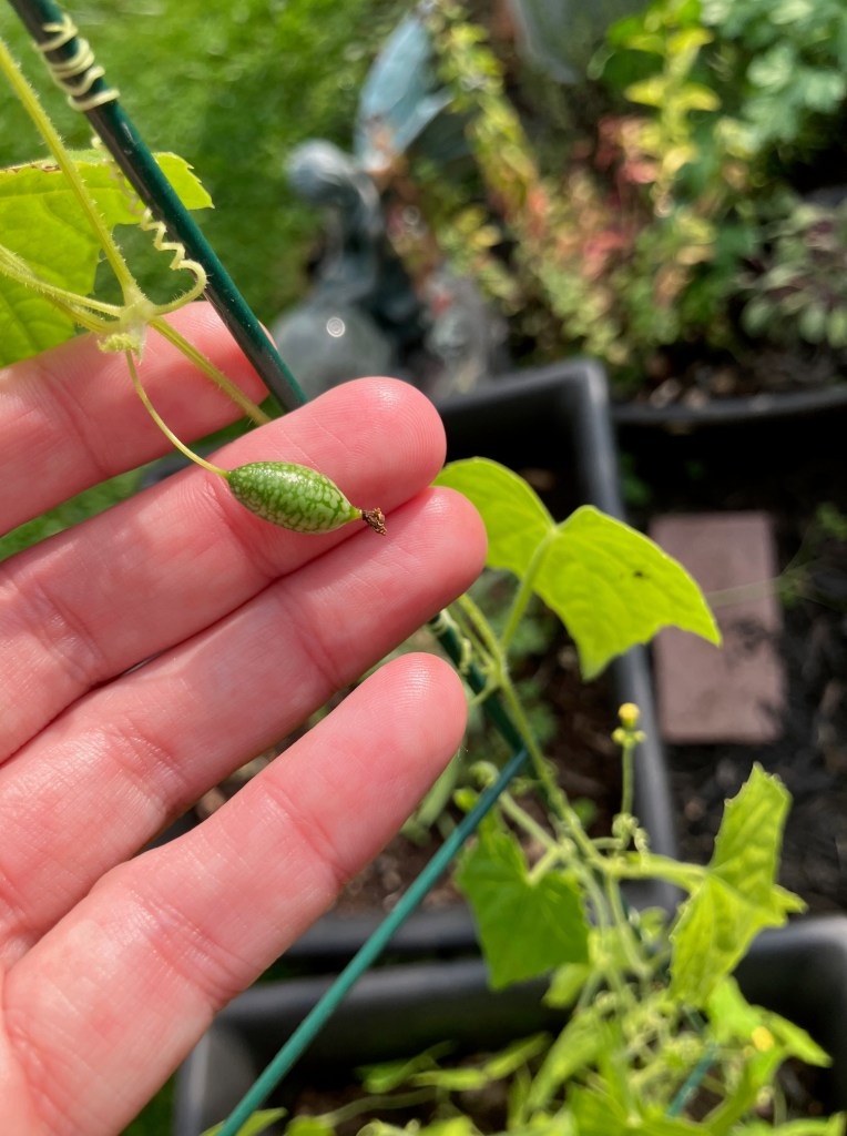 Last year we were overrun with cucamelons, but this year I wonder if we’ll get many. There’s lots of flowers, but this is the biggest fruit so far.