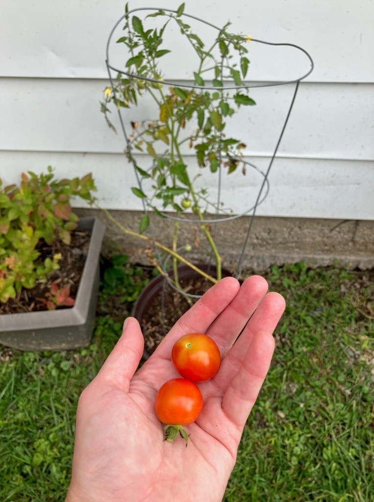 Last year we were overrun with tomatoes. This year, I’d say it’s just about right. And those red ones on the right… that was a plant that seeded from last years. I dug it up and put it in a pot in late July. So it’s really just bonus fruit!