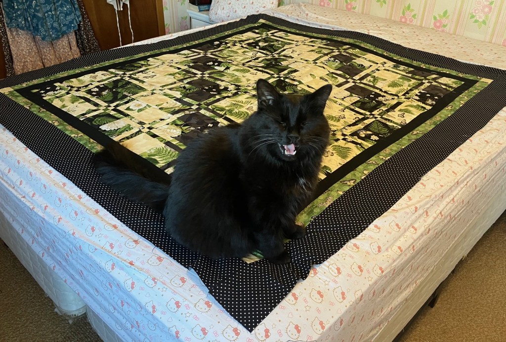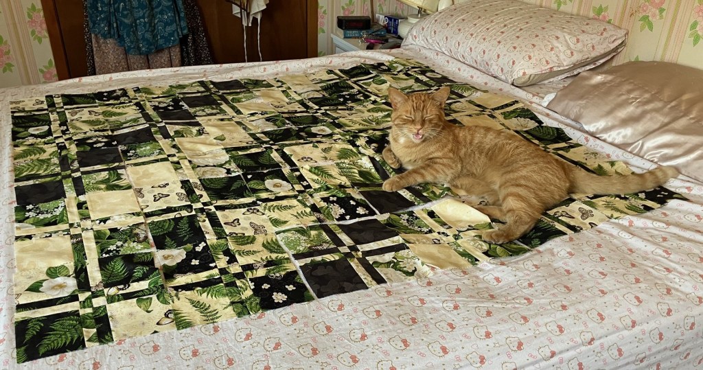 I used almost all of the layer cake – just six squares were leftover. That green butterfly border was from the layer cake too. It didn’t work with the layout for the main blocks, but it was too pretty not to use. So I sliced it up and had just enough for a skinny border.