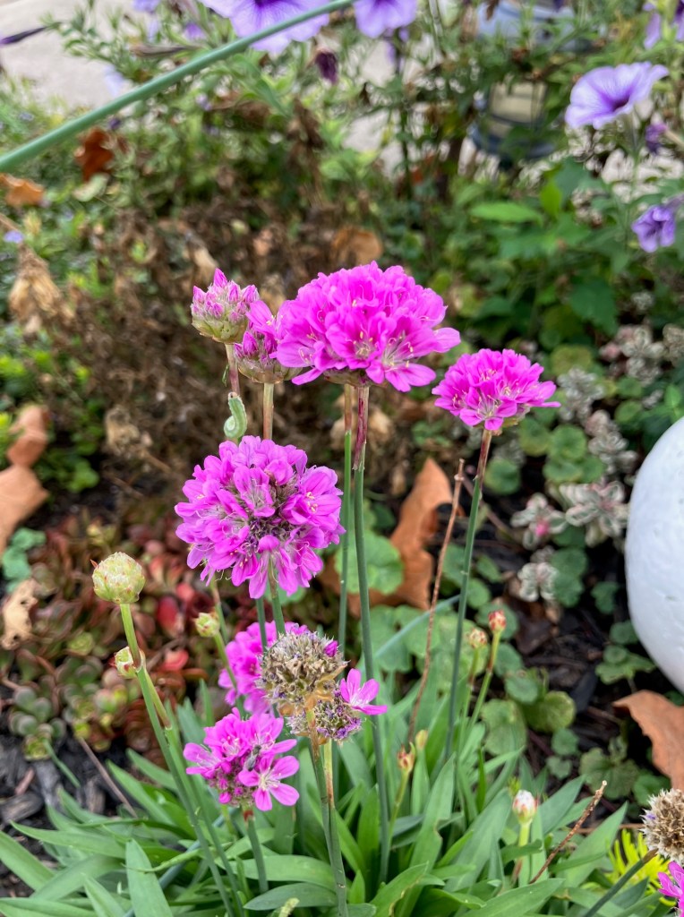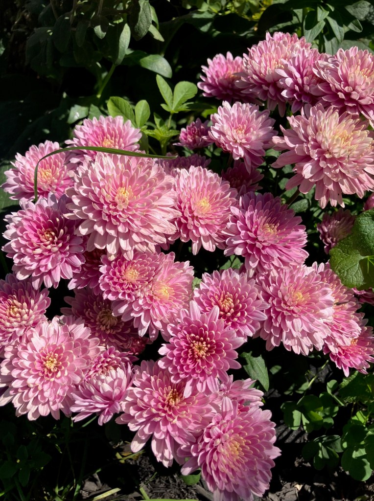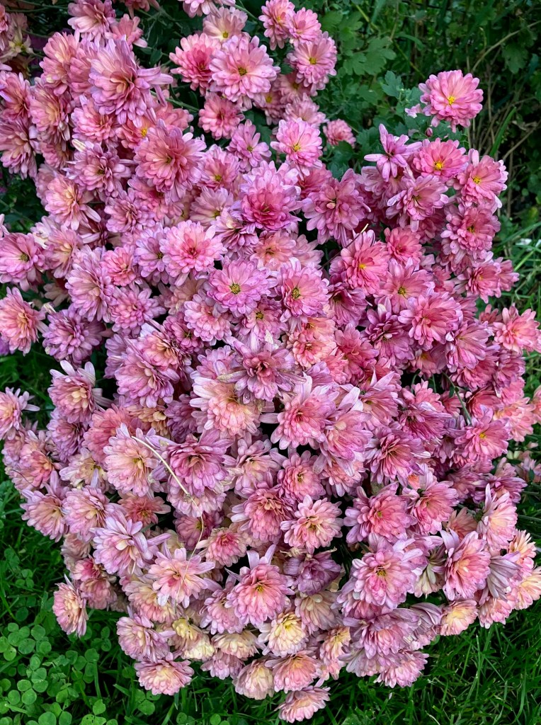 These two were both perennial mums bought from the grocery store. And although they look very similar here, the one on the left is much larger, and the one on the right it normally a much brighter pink.