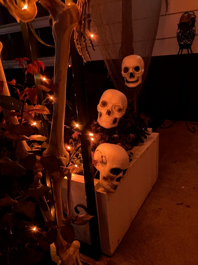The skulls on the left were thrifted additions (there are matching skulls in the box on the opposite side of the porch. In the picture on the right, the urn was thrifted, but the skeleton parts are new… it was an idea I saw online and I just had to have it for the garden.