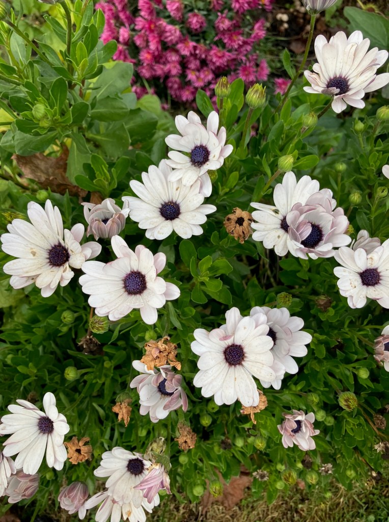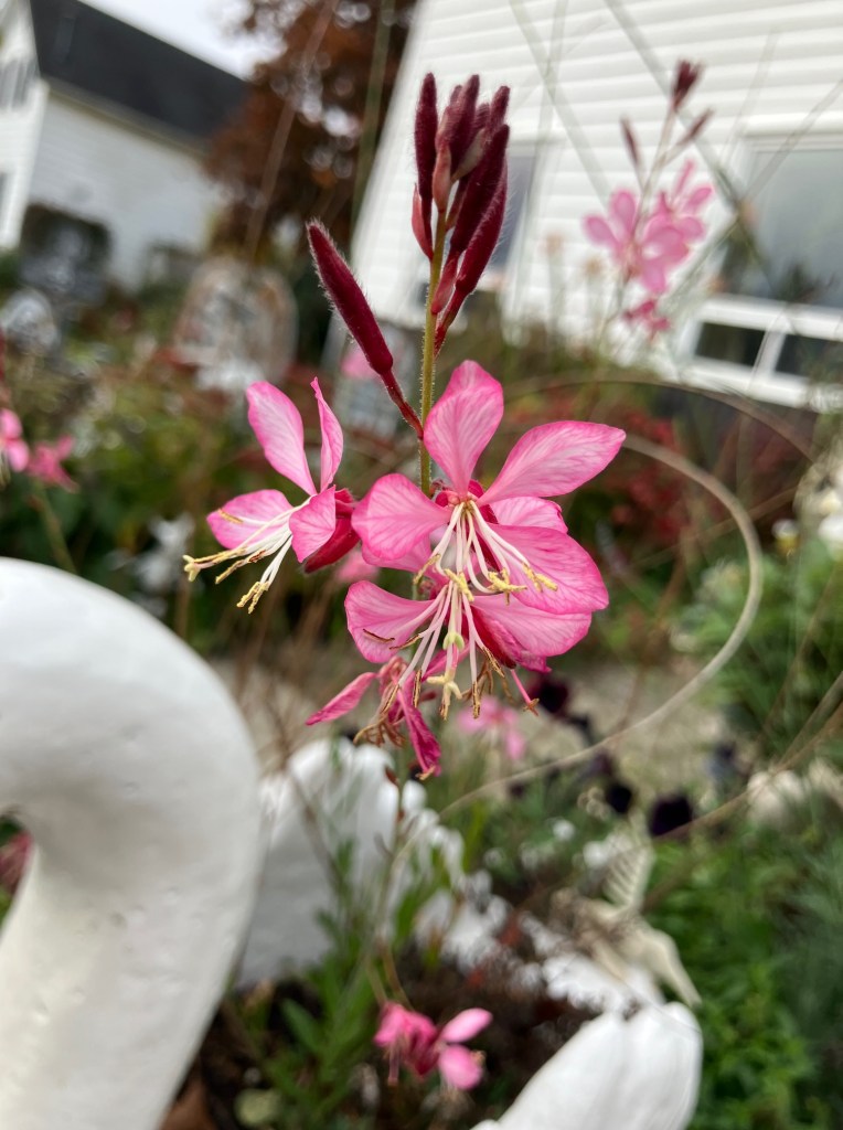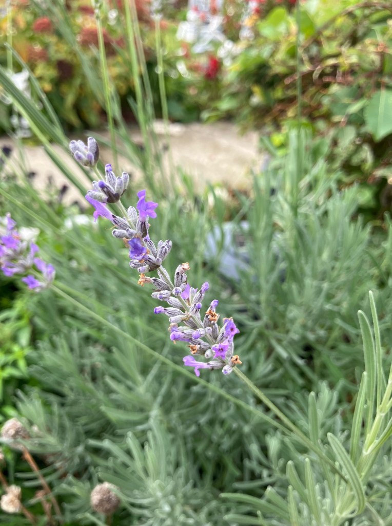Locked between the concrete path, and concrete driveway, the driveway garden holds a little more heat so it’s not a total to surprise to still have things blooming – Left to Right – Armeria, Gaura, and Lavender.