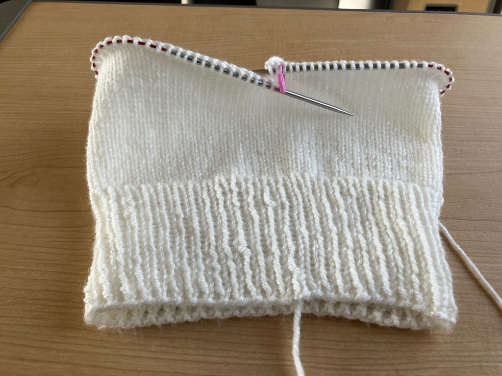 By the time I hit London (the stop before mine), I was through the ribbing and plain knitting. Now I’m ready to start the colourwork.