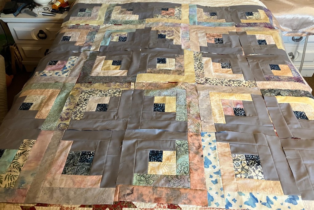 I banged out another 13 batik log cabins, bringing my total to 25. And I though that would be a good amount. It would make the quilt 60 x 60. But that was until I laid them out….
