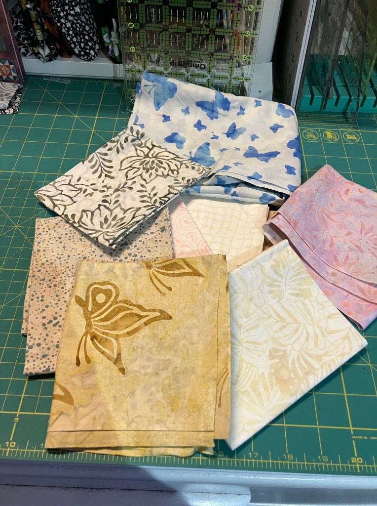 Sunday was studio day. First, I took a look at possibilities for the log cabin quilt. To make the patterns whole, I would need 11 more blocks. I had enough pastel batiks I could pull from…