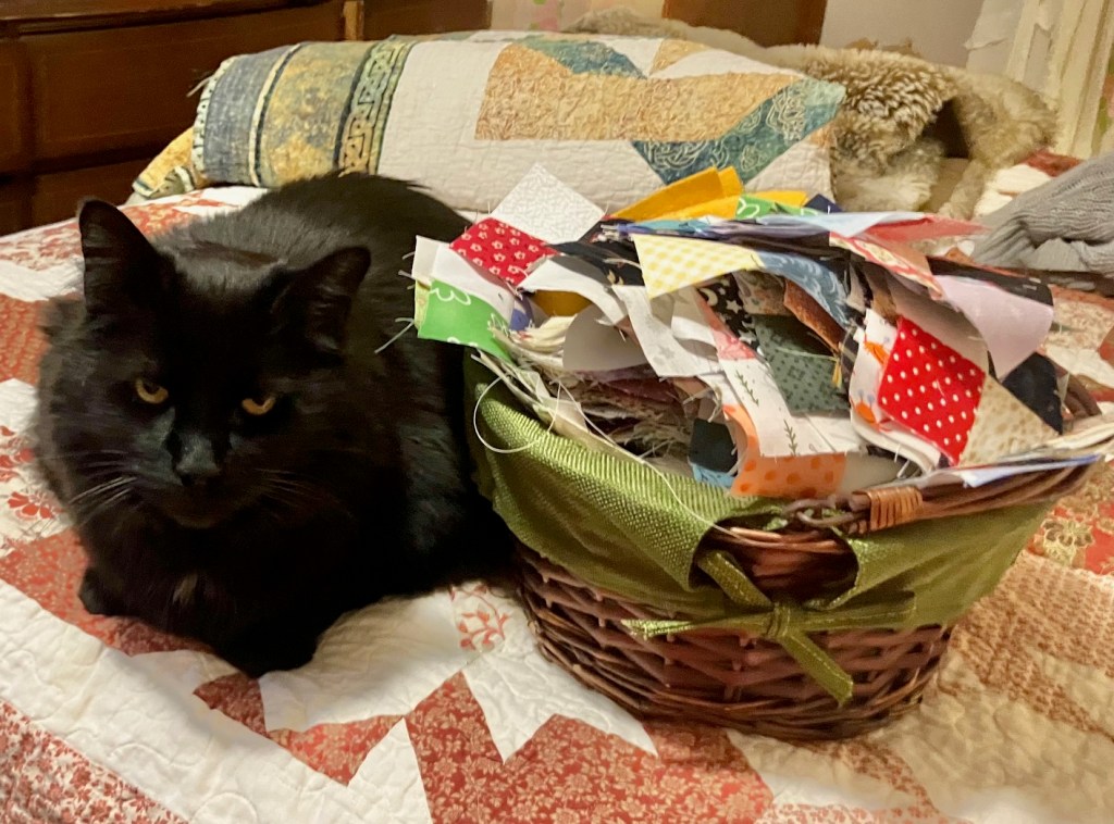 That basket is overflowing with all the little Leader/Ender two-patch postage stamps turned into four patches. Yep – we worked our way through them all already! Burton, is not nearly as excited about that as I am.