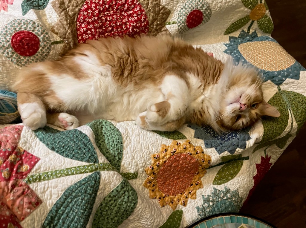 The sshrug is coming along–the stripes help me to keep knitting, urged on by each color change! Too funny about the yarn maniac cat!