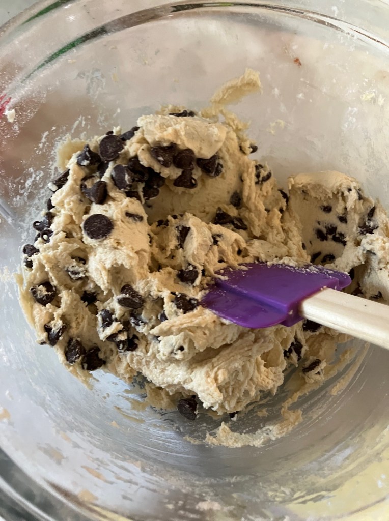 Hand mix in chocolate chips. Scoop on cookie sheet using a spoon. Space out -they will flatten (generally 12 to a sheet). Bake 8-12 minutes depending on oven.