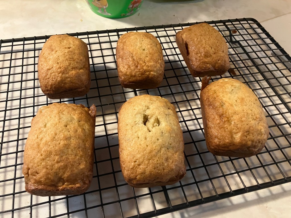 Pour into greased loaf pan. Bake at 350 – 50-60 min (If you’re making mini-loafs – it’s about 20 mins).