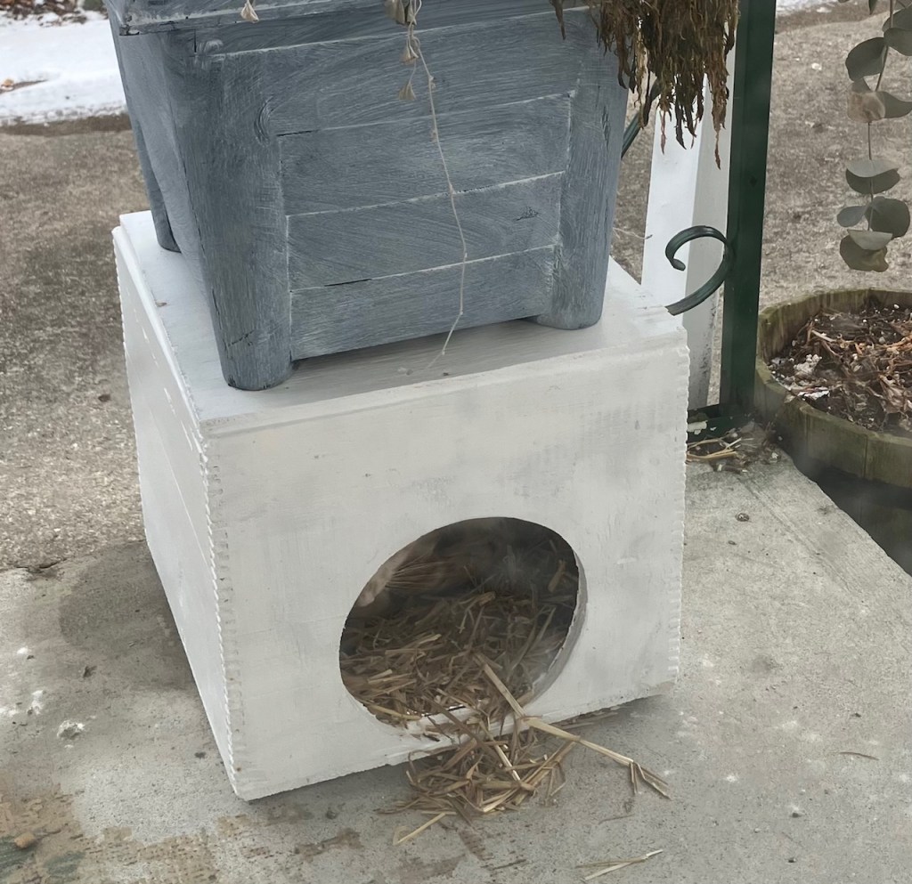 But it’s double the size, with two rooms (like Furby’s fancy one) so Louis can get tucked away from the wind better. The top also comes off so we can periodically clean out the old straw.