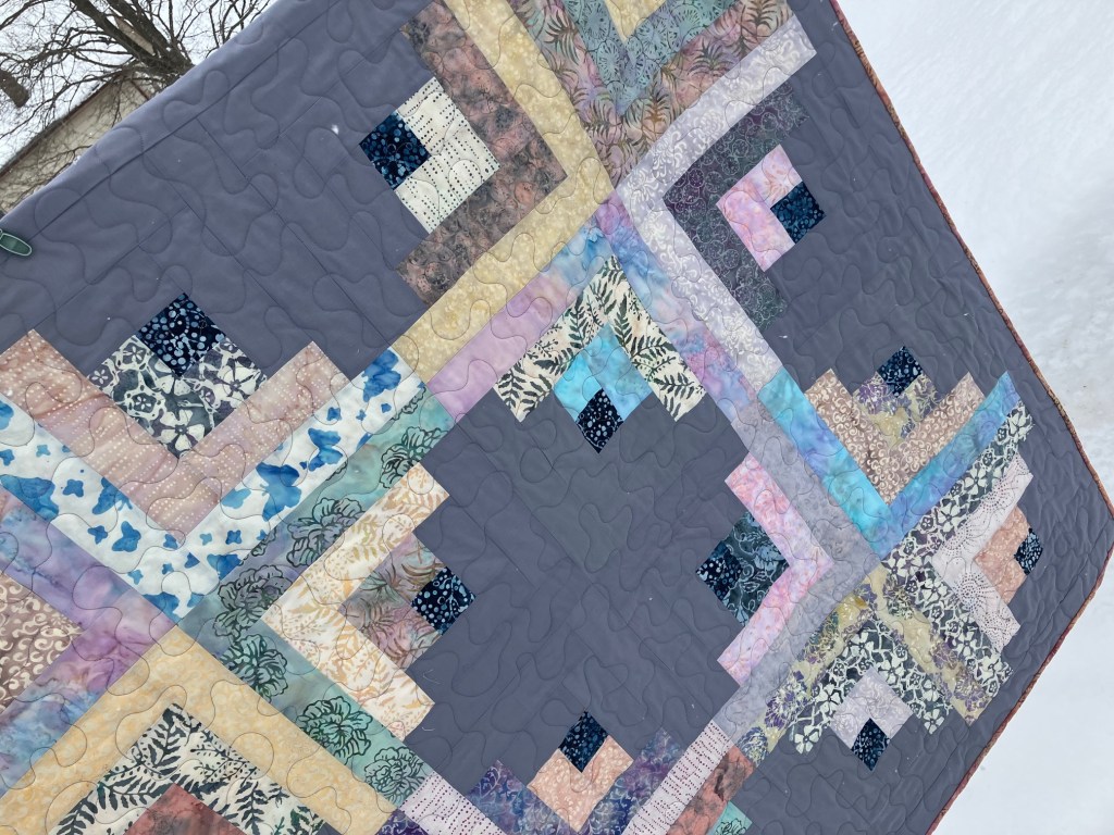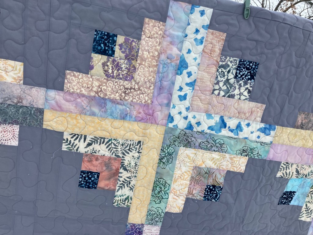 This quilt was made mostly from one jelly roll. Near the end, I had to add in a few strips from the wider batik stash. The blue doors were leftover from the snowflake quilts I made in 2023. And the grey solid it from one of the solid Kona bolts I keep in stash. (I have several neutrals that I keep in stock for backgrounds)
