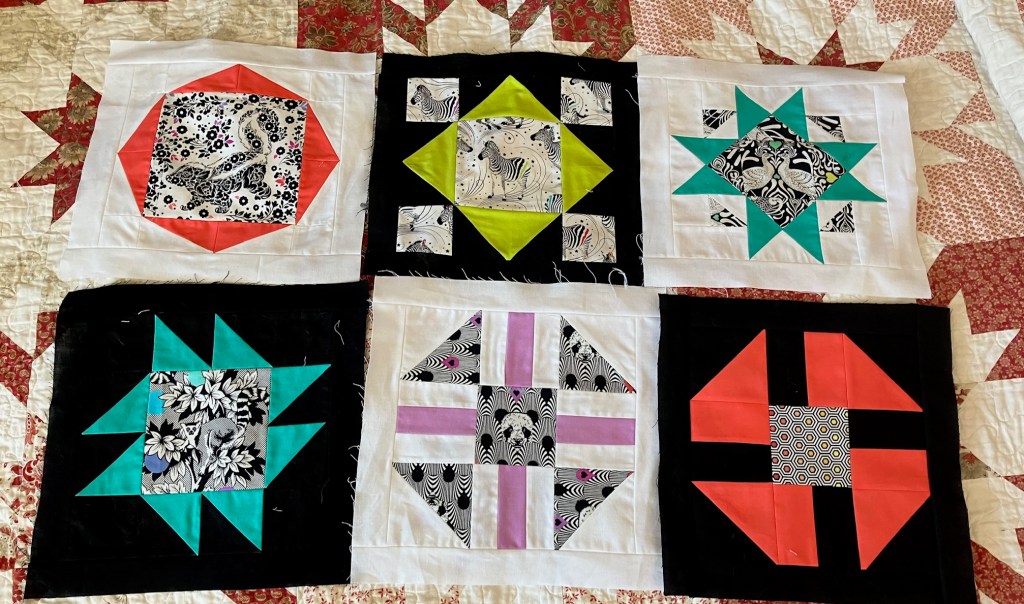 I may play with the layout before sewing them together, but as of this moment, this is the best arrangement for the colours/prints as made.