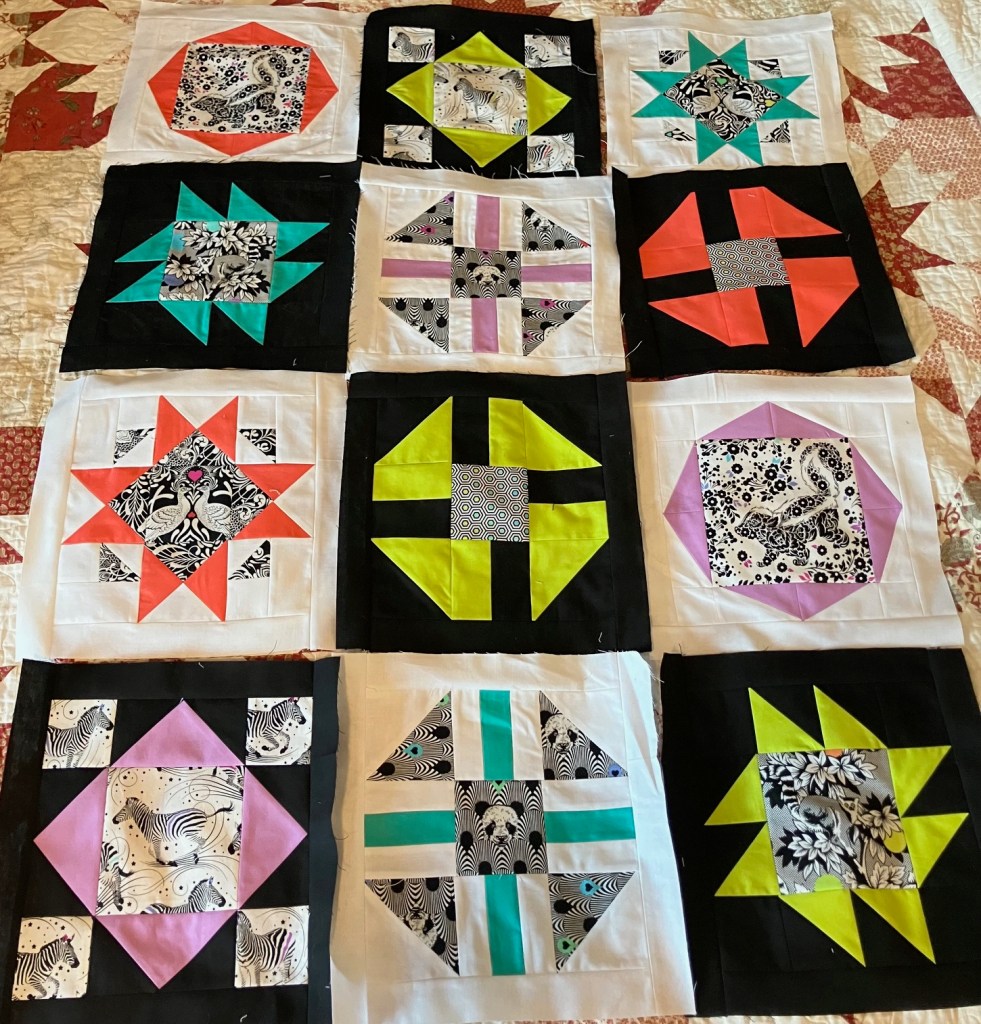 It still took until dinner time, but I am thrilled to show you all 12 finished blocks together.