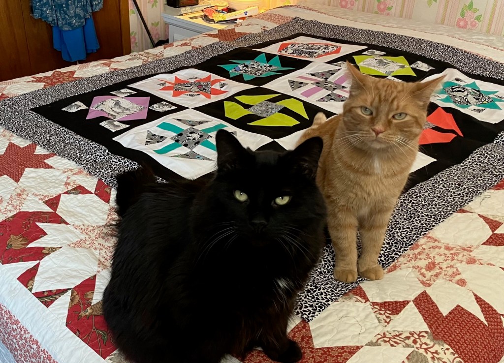 Whether or not they like it, I’m counting it as complete. It’s not huge, just 44″ x 55″ but it’s nice for a little lap quilt. I cut some more of that vine fabric from the border for the binding. I’ve got a back in mind for it, but I wasn’t in the mood to go digging through the boxes to find it.