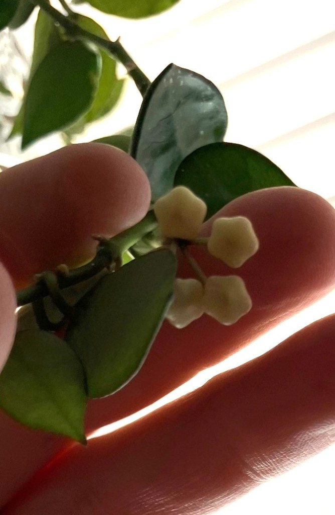 Upstairs in my office, I have this small-leafed hoya. It’s my happiest hoy. And I know that because it blooms every few months or so.