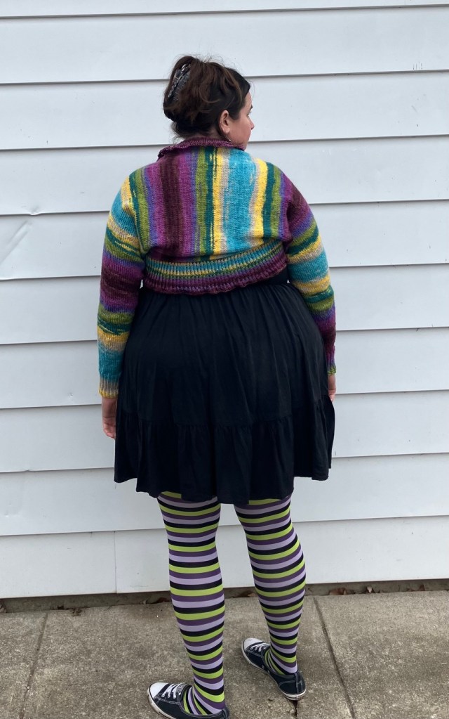 The yarn is Liberty Wool that I got at Value Village for just $6. Colour is 7972-Teal Chameleon. And it’s certainly fun! It’s something that’s a bit outside my normal fashion wheel house. I’ve only got a handful of dresses that will work with it. But it’s certainly helped cheer me up through the grey January/February doldrums. And it’s definitely nice and warm to wear!