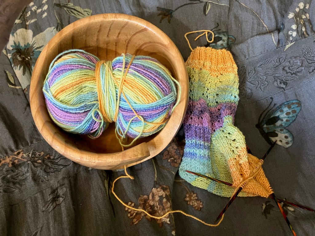 In fact, I’m almost to the toe. I’m not loving working with the cotton – but the colours are making it worth dealing with. I expect to have the second sock started soon.