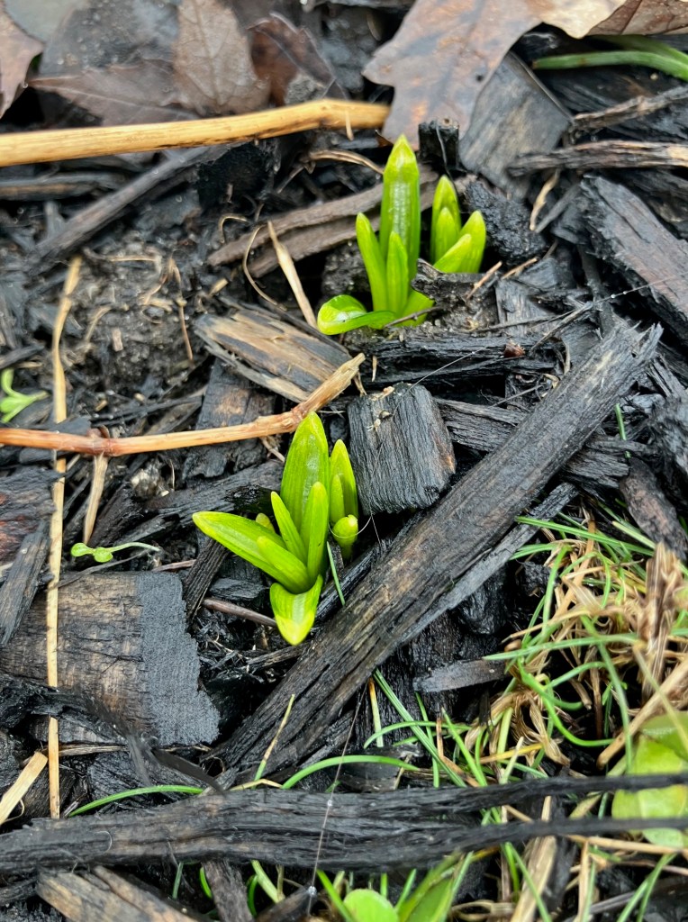 There are little green sprouts from bulbs coming up everywhere. I can’t tell what these ones are yet…but it doesn’t take much warmth for them to get going. I’ll be able to tell most of them apart soon enough.