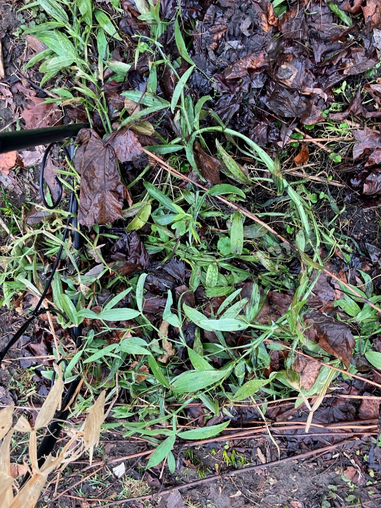 I was VERY surprised to find a whole bunch of very green Sweet Pea vines. It must have been nice and toasty under the snow. These are perennial Sweet Peas, so they are hardier than the annual ones – and I guess that means they can grow under snow!