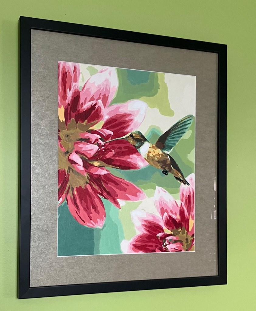 I’d like to finally share a properly framed hummingbird paint-by-number