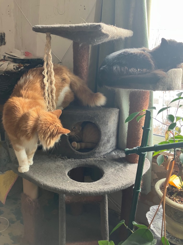 I’d like to say that inter-cat relations have improved. And they have… albeit minutely. I think part of it is that with the nicer weather, Furby is getting out and running off all his energy more. (I don’t think I’m ever going to be able to confine him to the house/catio).