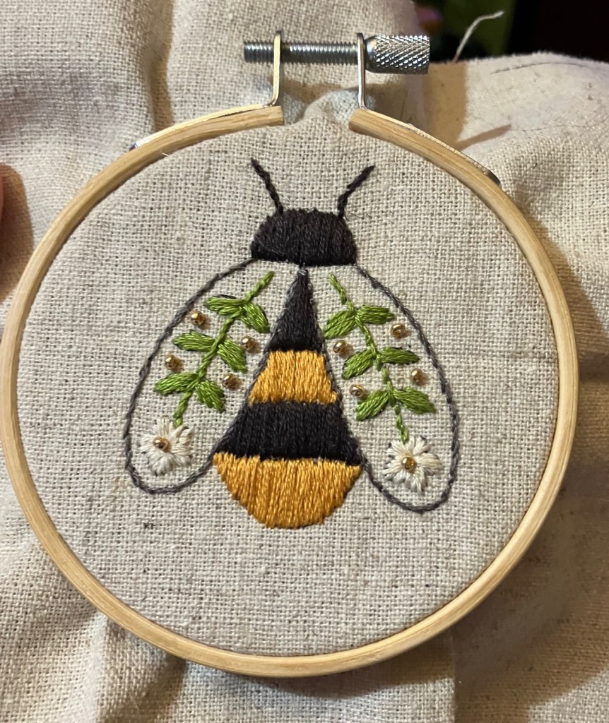 I’d picked them up at Michaels ages ago, because they were small, cute and cheap. They come with everything you need, including the needles. I decided to start with the bee.