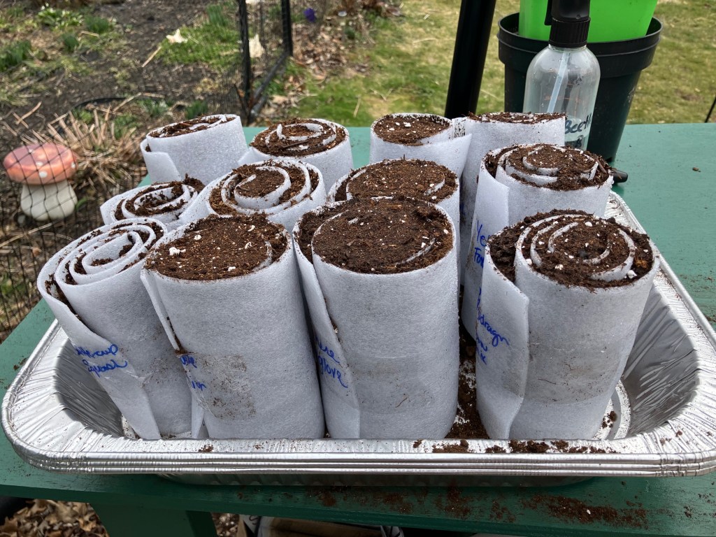 There, I rolled up 12 more snails containing all my foxglove, snap dragons, marigolds, cosmos (there’s going to be so many cosmos this year!), pumpkins, squash and cucamelons.