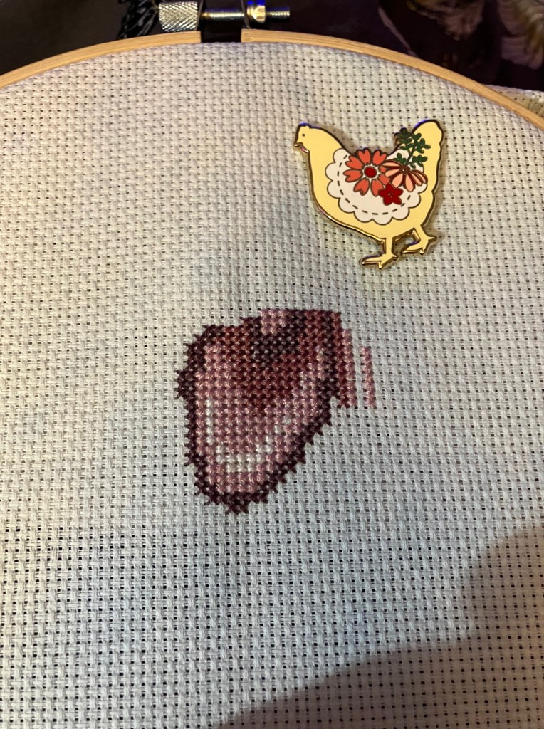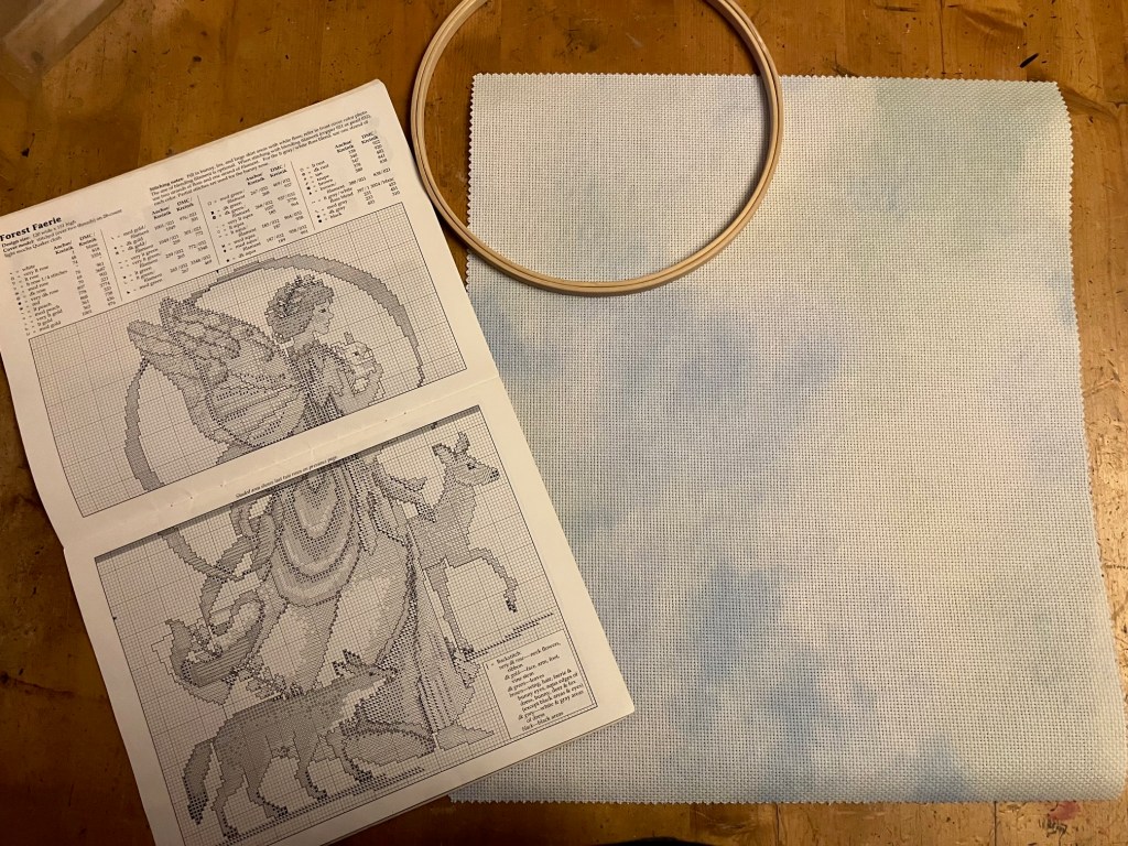 I picked up this pretty dyed aida at Michaels. It doesn’t show here but there’s a fair amount of green mixed in with the blue. It’s 14 ct, which feels a little weird for me as most of my projects lately have been much smaller at 18 ct.