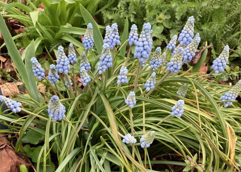 The Grape Hyacinths! I have them in multiple colours, and as you can see, they are looking fabulous! I’ve got several clumps I can split up and spread around. (Not that they don’t do that on their own!)