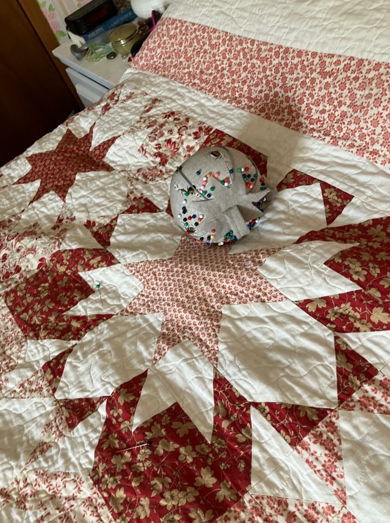 I did not leave that pincushion on the bed. Nor did I pull out a pile of those pins and scatter them all over the blanket so someone could enjoy a pointy scavenger hunt….