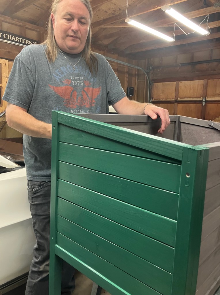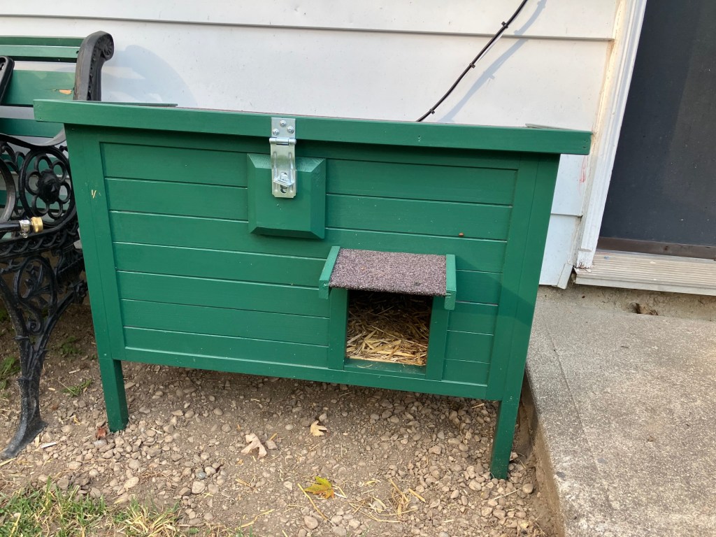 And an insulated cat house** was being delivered. Of course, he had to repaint it in our signature green so it matches the yard.