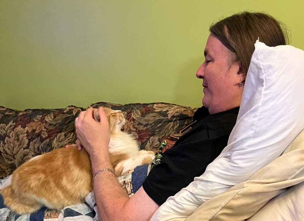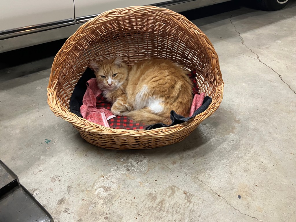 Dave started letting him into the music studio***…. where he put ANOTHER food dish and cat bed. Of course, that door can’t be left open, so Furby can only make use of it when the weather is nice and Dave is around.