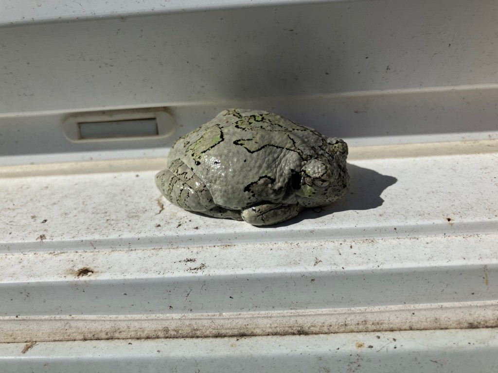 You will recall that last year, we had several of these grey tree frogs in the yard. Mostly the front garden. I assumed it was because we cut down several trees in the backyard, and they got displaced. My theory seemed proven, because up until Monday, I’d only had one other tree frog in the yard this year. And I have been checking the front gardens around the butterfly bush (where most of them were spotted last year) on a regular basis. I’ve heard them around… but haven’t seen them.