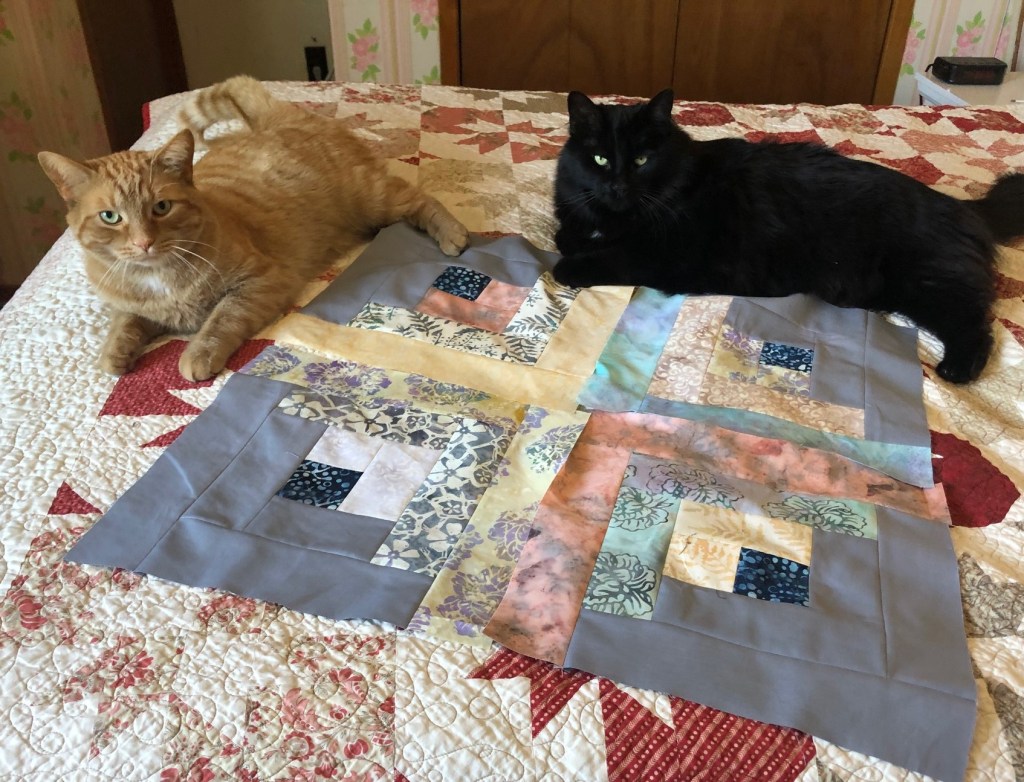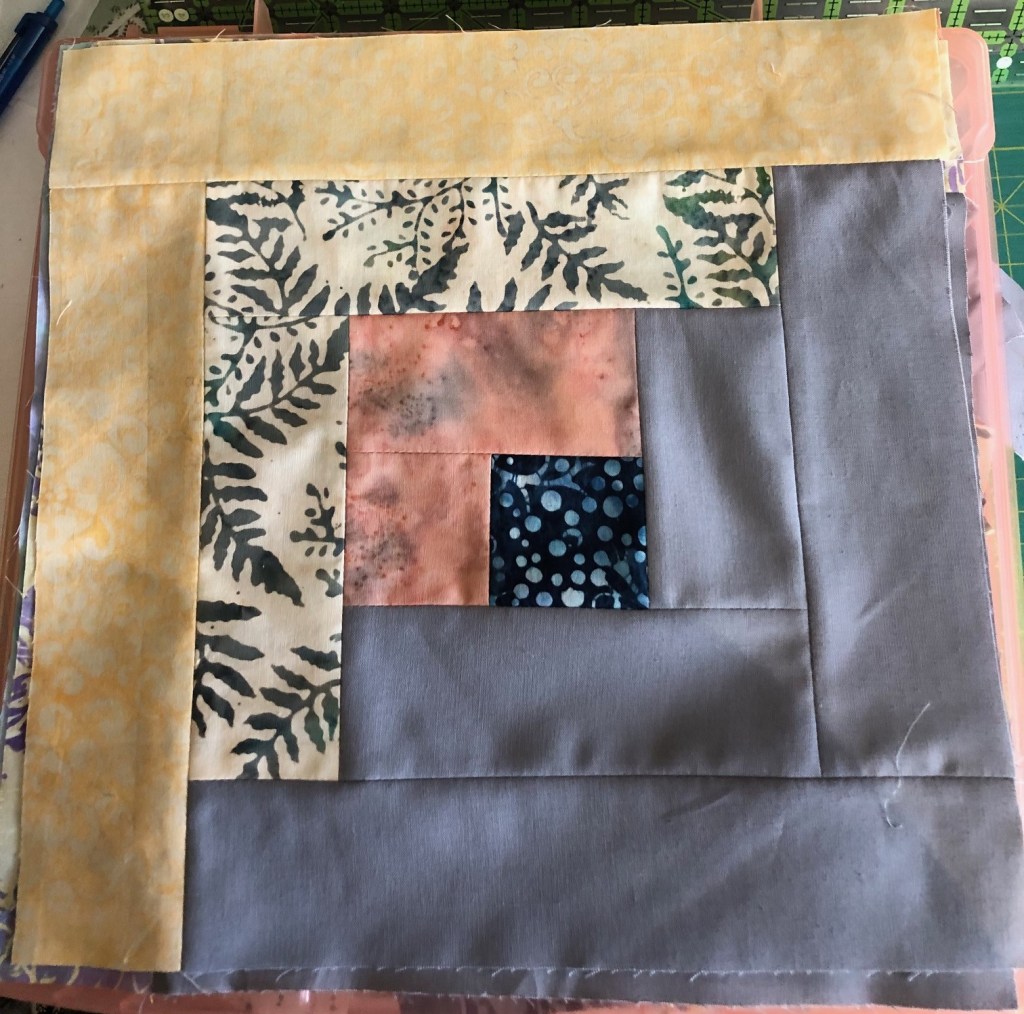 I came up with a batik Jelly Roll and decided to make some log cabins with some nice solid grey. I only got four cabins done.